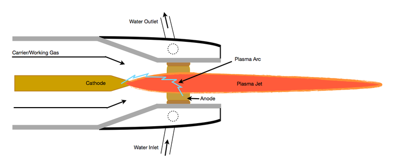 大氣等離子噴涂(APS)是應用最早、最廣的一種熱噴涂技術,整個噴涂過程在大氣環境下進行。APS通常利用Ar、N2和He作為工作介質,其核心部件是等離子噴槍,工作原理是在陽極和陰極之間通入上述工作氣體作為介質,使其電離并產生等離子弧,通過等離子弧的作用進一步將噴涂材料加熱至熔融或半熔融狀態后進行噴涂。
