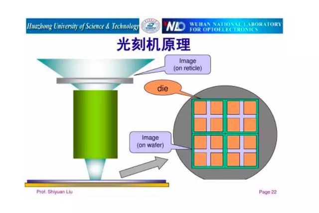 在光刻技術(shù)的原理下,人們制造了光刻機,光刻機通過一系列的光源能量、形狀控制手段,將光束透射過畫著線路圖的掩模,經(jīng)物鏡補償各種光學(xué)誤差,將線路圖成比例縮小后映射到晶圓上,不同光刻機的成像比例不同,有5:1,也有4:1。然后使用化學(xué)方法顯影,得到刻在晶圓上的電路圖(即芯片)。