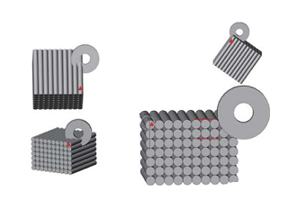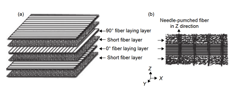 新型的 2.5 維或者 3 維 C/SiC 復合材料如圖 2所示,C/SiC 復合材料除 X、Y 方向上層層垂直疊加的排布及短小纖維層外,層與層之間多出 Z 方向上 0.5 維或者 1 維的針刺碳纖維材料,增強了纖維材料層與層之間的聯結性能,并且多出的 0.5 維或1 維的針刺碳纖維材料使材料的各項性能都有了一定的提升,對材料在加工或者使用過程中的分層缺陷起到一定的抑制作用。2.5 維和 3 維 C/SiC 復合材料相較于 2 維 C/SiC 復合材料,具有更高的層間剪切強度、更好的撓性等,但其制備難度和去除加工難度也高于 2 維 C/SiC 復合材料。