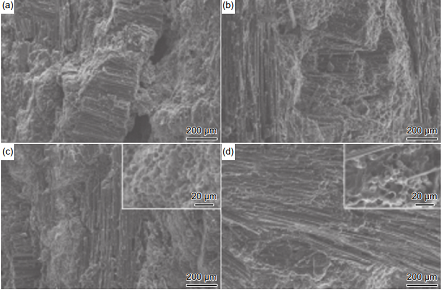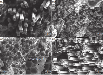 圖 8 HPS-C/SiC 復合材料不同纖維含量斷裂表面形貌:(a)纖維含量 10% 的 C/SiC 復合材料;(b)纖維含量 20% 的C/SiC 復合材料;(c)纖維含量 30% 的 C/SiC 復合材料;(d)纖維含量40% 的 C/SiC 復合材料