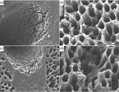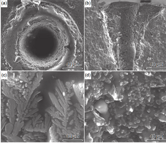 圖 14 C/SiC 復合材料的飛秒激光加工 SEM 圖 (a)孔入口;(b)孔截面;(c)類硅酸鹽枝晶;(d)孔內壁
