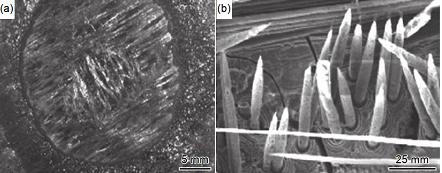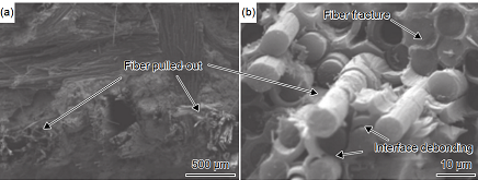 圖 17 C/SiC 復合材料電火花加工的表面形貌(a)裂紋擴展(b)纖維斷裂