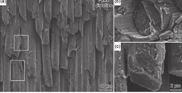 圖 9 2 維 C/SiC 復合材料的銑削加工形貌圖:(a)切削速率 vc = 40 m/min;進給速率 f = 0.01 mm/min;(b)壓縮纖維斷
