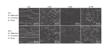 劉瓊等通過磨削實驗發現磨削參數對表面磨削質量有一定的影響,不同纖維排布方向易出現的加工缺陷不同。Liu 等通過金剛石砂輪磨削2 維 C/SiC 復合材料,研究纖維角度對磨削加工表面質量的影響,纖維角度在一定范圍內,表面粗糙度隨著纖維角度的減小而降低。Qu 等用磨削加工的方法對 C/SiC 復合材料進行加工,如圖 11 所示,研究表明:纖維角度對磨削加工表面質量有顯著 的 影 響 。Du 等通過電鍍金剛石砂輪磨削2 維 C/SiC 復合材料,對纖維定向磨削工藝進行研究,在實驗條件一定的情況下,磨削切向力與法向力相比要大一些,這與研磨普通材料不同。李巾錠等采用 Abaqus 軟件建立有限元模型,數值模擬單顆粒金剛石平面磨削的過程,發現隨著鉆速的提高磨削力變小,加工質量提高。