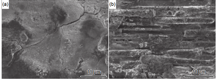 圖 6 CVI-C/SiC 復合材料經過燒蝕后的表面形貌 (a)燒蝕表面微觀形貌;(b)燒蝕亞表面微觀形貌