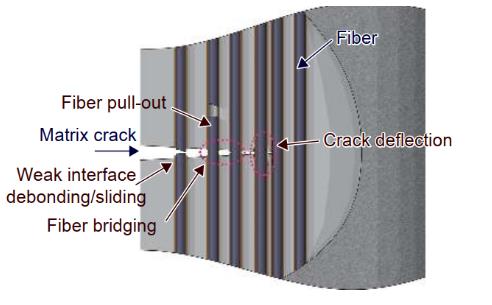 在基體中引入自愈合相也可以提高 SiC/SiC 復合材料的疲勞極限。 Ruggles-Wrenn 等研究發現,對于由 CVI 工藝和 MI 工藝制備的純 SiC 基復合材料,在卸載的過程中,氧化反應產生的氣體從基體中釋放出來,在重新加載時,氧化物則再次通過基體裂紋進入材料內部,氧化造成的基體裂紋增長是材料壽命限制機制。相反,由 CVI 工藝制備的具有多層交替結構的 SiC-B4C 自愈合基體,能夠捕捉氧并與之反應生成可流動的氧化相從而使基體裂紋愈合,能夠有效阻止纖維和界面的進一步退化,該基體類型材料的疲勞破壞主要取決于纖維。
