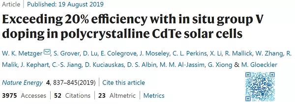 9. 多晶CdTe太陽能電池中原位摻雜V族元素的效率超過20%