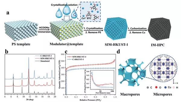 二維(2D)層狀MnO2材料由奇異的電子特性和帶有堿金屬離子的活性位組成,為開發具有化學修飾的催化劑提供了一個全面的平臺。值得注意的是,含K+的層狀MnO2催化劑已被證明是甲醛催化氧化(HCHO)的強力候選者。揭示活性部位上的堿金屬離子的影響對于了解反應物與活性中心之間的相互作用至關重要。通過將分析工具與周期性計算密度泛函理論模型相結合,通過比較三種典型的插入的堿金屬離子(Na+,K+,和Cs+)層狀MnO2材料。這些材料是通過熔融鹽法合成的,具有高收率,較大的橫向尺寸和納米厚度。文章證明了堿金屬離子可以通過CsMnO(1.94 eV)<KMnO(1.97eV)<NaMnO(2.07eV)<理想的MnO2表面而無插入離子(2.23 eV)的順序顯著改變Vo的形成能。結果,具有最多表面Vo位置的CsMnO可以實現有效的HCHO氧化為CO2,在40°C的200 ppm HCHO/潮濕空氣中,HCHO的消耗速率約為0.149 mmol/(g·h)。與Mars-van-Krevelen過程不同,量子化學計算和原位漫反射紅外傅里葉變換光譜表明,主要反應途徑可能是HCHO(ad)+[O](ad)→DOM→[HCOO-]s→通過Langmuir-Hinshelwood(LH)機制產生的CO2。堿金屬通過在Vo位點捕獲氧并加速吸附的氧與吸附的HCHO到深度降解產物(CO2和H2O)之間的易反應,顯著促進了HCHO的轉化。Unveiling the Effects of Alkali Metal Ions Intercalated in Layered MnO2 for Formaldehyde Catalytic Oxidation.(ACS Catal., 2020, DOI:10.1021/acscatal.0c02310)7.Adv. Energy Mater.:超級電容器用有序大孔微晶單晶MOF及其衍生碳材料的制備