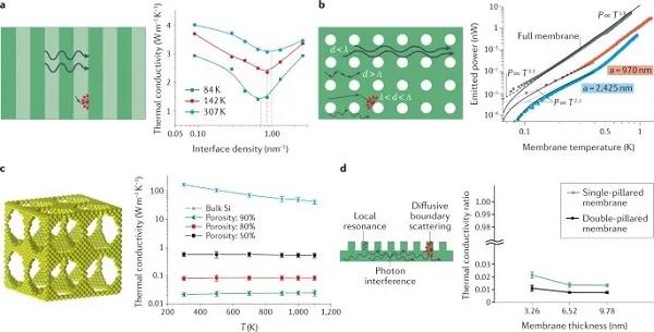 (a)一維超晶格中的相干(波浪線)和擴散(直線)聲子散射(左)。(b)二維納米聲子晶體(NPC)中聲子輸運的三種可能機制是由聲子波長λ、聲子平均自由路徑Λ和NPC周期d(左)之間的關系決定的。(c)三維NPC以及具有不同孔隙率的三維NPC和體硅的熱導率隨溫度的變化。(d)柱狀結構導熱系數降低的三種機制示意圖,雙柱撐膜(兩側有柱)和單柱撐膜(僅一側有柱)的導熱系數比相同厚度的均勻膜低兩個數量級。