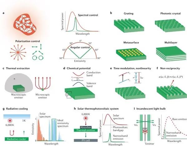 (a)傳統的黑體熱輻射(橙色)和納米結構控制的熱輻射(綠色)。(b)用于熱輻射控制的納米結構,包括光子晶體、光柵、超材料和多層膜。(c)超越普朗克定律:在宏觀發射器和微觀熱天線中通過熱提取增強吸收截面。(d)在具有非零化學勢μγ的半導體中,通過分離電子ηc和空穴ηv的準費米能級,可以獲得非平衡熱輻射。(e)非平衡熱輻射可以通過時間調制引起的頻率躍遷和非線性來實現。(f)超越基爾霍夫定律:非互易熱輻射。在非互易系統中,角光譜吸收率α和發射率ε之間的平衡可能被打破。(g)白天輻射冷卻可以使用在整個太陽光譜上吸收率接近零的材料,并且在8-13 μm光譜范圍內具有強發射率。(h)太陽能熱光伏系統:一個中間元件吸收入射的陽光加熱,然后根據太陽能電池的帶隙產生熱輻射。(i)超越基爾霍夫定律:非互易熱輻射。在非互易系統中,角光譜吸收率α和發射率ε之間的平衡可能被打破。