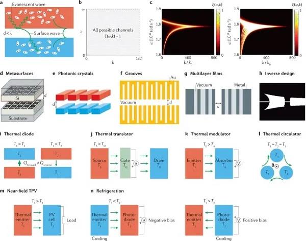 (a)跨度為d或小于峰值熱波長λ的真空間隙的近場輻射傳熱示意圖。(b)在頻率-波矢(ω-k)空間上所有可能通道的近場輻射傳熱的理論極限。(c)一對間隔為10 nm的SiC平板之間的光子傳輸概率ξ(ω,k)的圖。(d-h)增強近場輻射傳熱的平臺包括超表面、光子晶體、溝槽、多層膜和通過逆向設計獲得的結構。(i-n)近場傳熱器件的概念包括熱二極管、熱晶體管、熱調制器、熱循環器、近場熱光伏、器件和近場正、負發光冰箱。