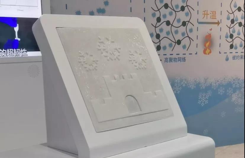 給水凝膠加上一層自制冷裝置,就能做出冰板、冰墻。升溫時水不滴落,可以用于制作精美浮雕——這是世界上現有的唯一可長期在冰上保存浮雕的技術方案。在科技館中展出的冰板上,就雕刻著“城樓”和“雪花”。雖然摸的人不少,但圖案的形狀一直保持清晰。