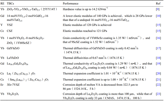 由于傳統(tǒng)的 YSZ 涂層已無(wú)法滿足新一代發(fā)動(dòng)機(jī)更高的耐熱耐蝕要求,因此當(dāng)前高性能的熱障涂層研制工作集中在稀土摻雜改性的方向上。為提高YSZ涂層的耐 Na2SO4 + V2O5熱腐蝕性,Song等摻雜微量的稀土元素Yb、Gd,制備了5.6Yb2O3-5.2Gd2O3-9.5Y2O3-ZrO2(YGYZ)涂層。結(jié)果表明1374.15K熱腐蝕20h后,YGYZ 涂層 中 m-ZrO2的降解程度僅為 YSZ 涂層的 40% 左右,且 YGYSZ涂層具有較高的四方性。為改善La2Zr2O7 涂層的熱導(dǎo)率,Gul等在該涂層中摻雜了稀土元素 Ce,發(fā)現(xiàn)Ce元素的摻雜對(duì)La2Zr2O7涂層的熱導(dǎo)率影響很大。1574.15 K 時(shí),La16Zr14Ce2O56 涂層的熱導(dǎo)率約為0.80W/(m?K),遠(yuǎn)低于La2Zr2O7涂層(1.26W/(m?K))。可見(jiàn),稀土元素?fù)诫s有利于涂層性能的提高。為了更好地對(duì)比稀土摻雜涂層材料的性能優(yōu)勢(shì),將它們的性能列入表1。由表1可以看出,不同稀土元素?fù)诫s,涂層性能的改善程度也不相同。這可能是因?yàn)橄⊥猎刂g存在離子半徑、原子質(zhì)量、電負(fù)性等差異。同時(shí)也發(fā)現(xiàn),對(duì)于熱障涂層材料,可通過(guò)摻雜適當(dāng)稀土元素實(shí)現(xiàn)高溫相穩(wěn)定性、力學(xué)、熱物理以及抗熔鹽腐蝕等性能的改善,以獲得高性能涂層。