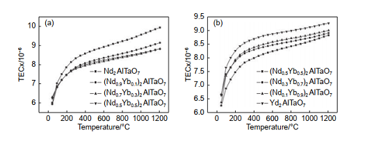 Zhang 等研究對(duì)比(Nd1-xYbx)2AlTaO7(x =0,0.1,0.3,0.5,0.7,0.9,1)涂層的熱膨脹系數(shù)變化時(shí),發(fā)現(xiàn) x < 0.5 時(shí),該涂層的熱膨脹系數(shù)隨 x 的增大而降低且變化程度逐漸變緩,x > 0.5 時(shí),為相反趨勢(shì)(圖 2(a),(b))。其原因在于稀土元素 Yb 相對(duì)于 Nd 有著較小的離子半徑、較大的電負(fù)性,引起晶格能增加和 IRE-O 鍵強(qiáng)降低。并在 x = 0.5 時(shí),這種綜合影響基本相互抵消,該涂層的熱膨脹系數(shù)達(dá)到最低,1474.15K時(shí),為 8.8×10-6K-1, 而Nd2AlTaO7 涂層 在 1474.15 K 時(shí)的熱膨脹系數(shù)為9.9×10-6K-1。這說(shuō)明電負(fù)性、離子半徑較大的稀土元素?fù)诫s有利于涂層熱膨脹系數(shù)的提高。基于電負(fù)性、離子半徑選擇稀土元素?fù)诫s,從而改善涂層的熱膨脹系數(shù)。目前利用稀土元素?fù)诫s實(shí)現(xiàn)涂層熱膨脹系數(shù)顯著提高的相關(guān)研究較少,而且,通過(guò)稀土元素?fù)诫s同時(shí)降低化學(xué)鍵強(qiáng)和晶體能的研究仍需進(jìn)一步深入。