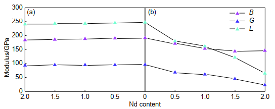Zhao 等選擇稀土元素 Nd 進(jìn)行摻雜,構(gòu)建了 Gd2-xNdxZr2O7、Gd2Zr2-xNdxO7( x = 0.0,0.5,1.0,1.5, 2.0) 。 通 過(guò) 模 擬 研 究 發(fā) 現(xiàn) , Nd 摻 雜 替 代Gd2Zr2O7 涂層中部分的 Zr 時(shí),其塊體模量、剪切模量、楊氏模量有了很大的降低,x = 2 時(shí),其塊體模量、剪切模量和楊氏模量達(dá)到最小值,比未摻雜的Gd2Zr2O7 涂 層 分 別 下 降 了 近 24%、 77%、 74%(圖 4)。隨后,Zhao 等擇取 Yb 為摻雜元素,系統(tǒng)性地研究了 Gd2-xYbxZr2O7(x = 0.0,0.5,1.0,1.5,2.0)涂層彈性模量的變化。研究發(fā)現(xiàn) x < 2 時(shí),該涂層的彈性模量均低于未摻雜的 Gd2Zr2O7 涂層;x = 0.5 時(shí),其塊體模量、剪切模量、楊氏模量值最低 , 分別為179.0 GPa、 88.9 GPa、 228.8 GPa。而Gd2Zr2O7 涂層的塊體模量、剪切模量、楊氏模量值分別為191.8 GPa、96.2 GPa、243.7 GPa,Yb2Zr2O7涂層塊體模量、剪切模量、楊氏模量值分別為206.5GPa、106.8 GPa、273.3 GPa。該作者又對(duì)比研究了Gd2Zr2O7 和 Yb2Zr2O7 涂層晶體結(jié)構(gòu)的彈性常數(shù),結(jié) 果 表 明 Yb2Zr2O7 晶 體 結(jié) 構(gòu) 的 彈 性 常 數(shù) ( C11、C12、C44)均大于 Gd2Zr2O7。因此 Yb 作為摻雜元素,降低 Gd2Zr2O7 涂層彈性模量的程度較低,而Gd 作為摻雜元素,大幅度降低了 Yb2Zr2O7 涂層的彈性模量。這些結(jié)果再次說(shuō)明了稀土元素?fù)诫s可有效降低涂層的彈性模量。未來(lái)可基于同種晶體結(jié)構(gòu),選擇彈性常數(shù)較低的稀土元素進(jìn)行摻雜,從而大幅度地降低涂層的彈性模量。